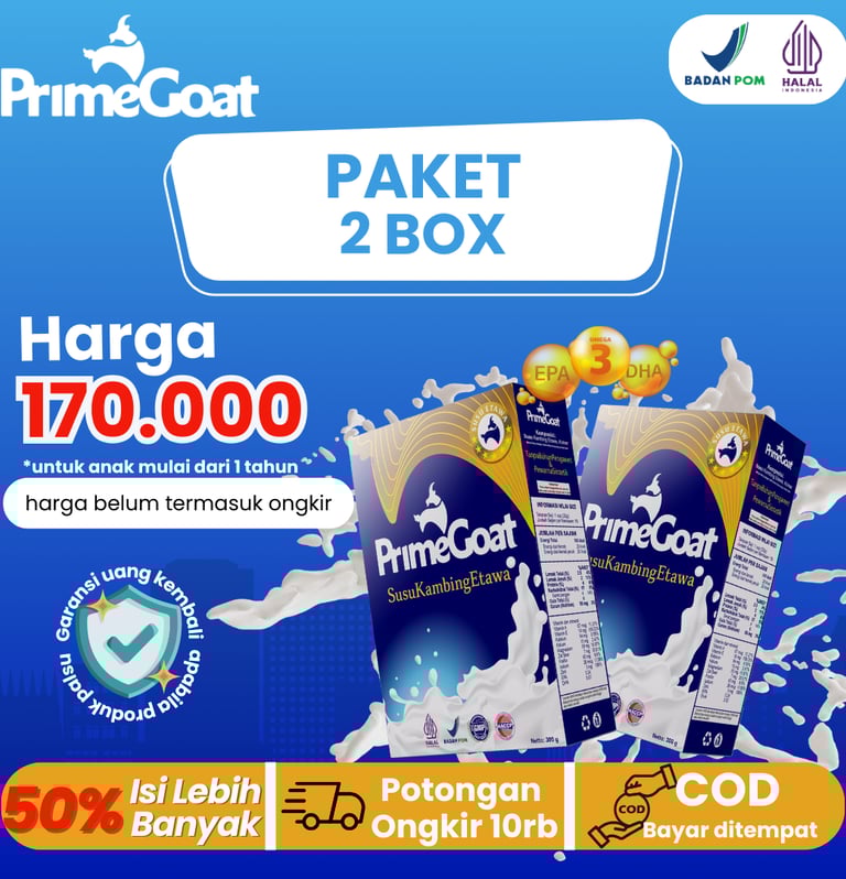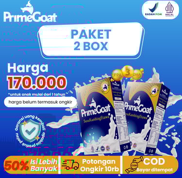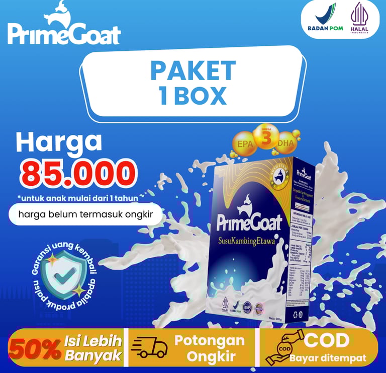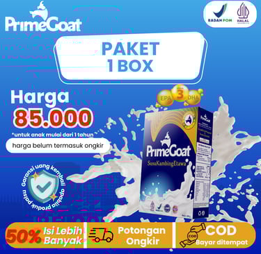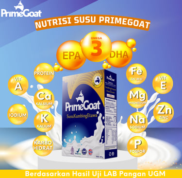 Dengan rasa original yang enak, bebas bau prengus, tanpa pengawet atau pewarna sintetik, PrimeGoat hadir sebagai pilihan nutrisi yang aman, berkualitas, dan bersertifikasi lengkap BPOM, Halal, GMP, dan HACCP.