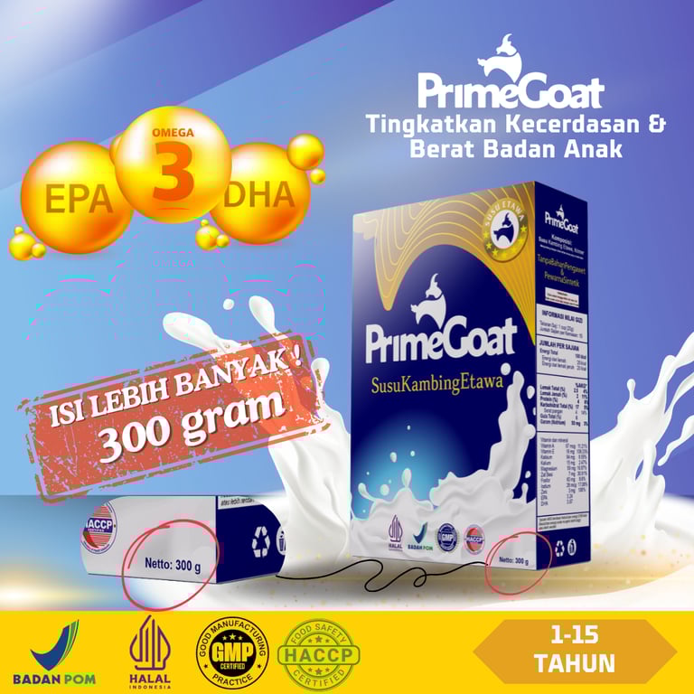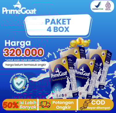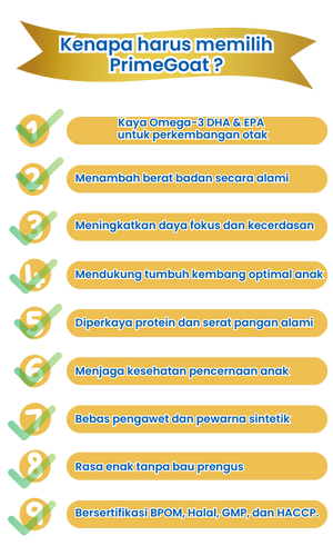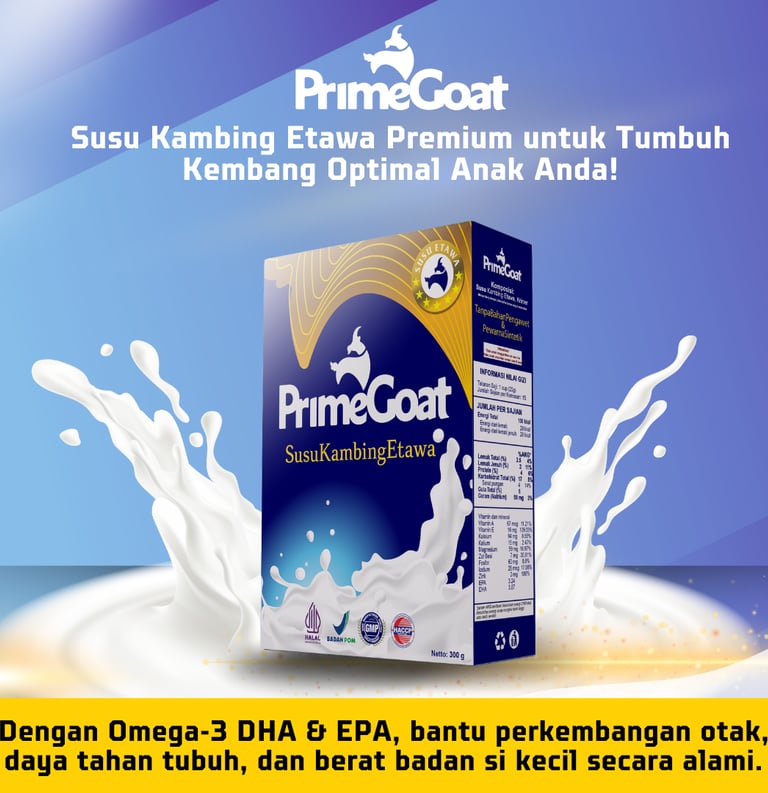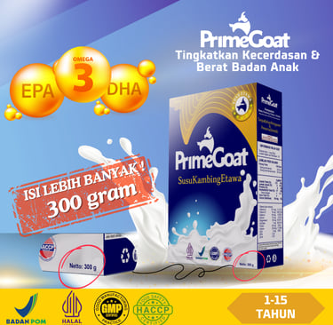 Susu PrimeGoat adalah susu kambing Etawa premium yang dirancang khusus untuk mendukung tumbuh kembang anak usia 1-15 tahun.