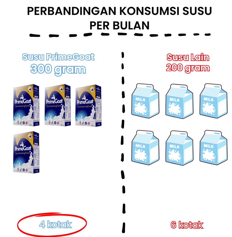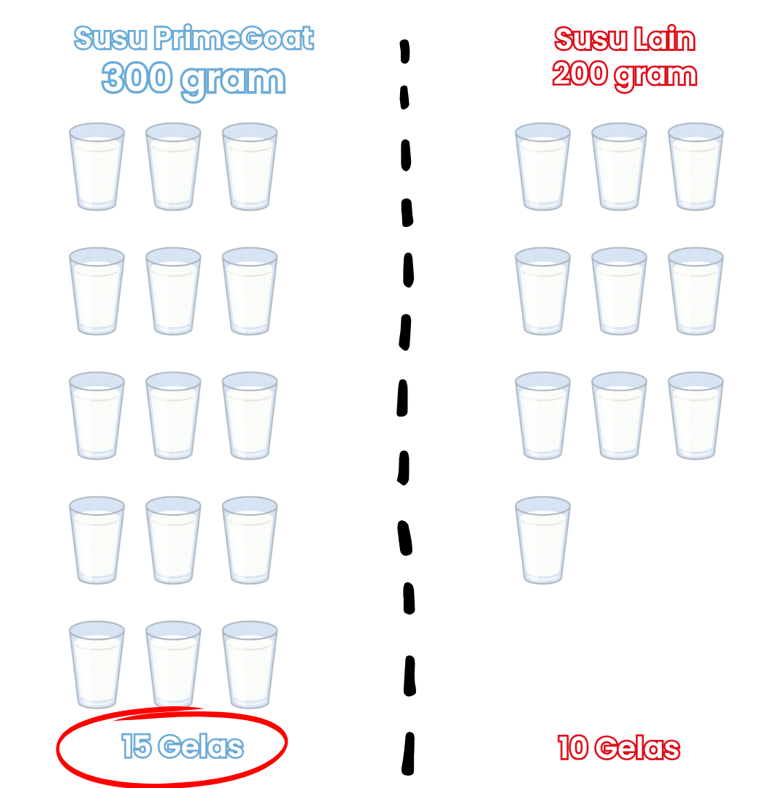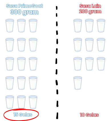 PrimeGoat hadir dalam ukuran 300g, memberikan 50% porsi lebih banyak dibandingkan susu lain yang hanya 200g. Dengan takaran ideal 20g per gelas, PrimeGoat menghasilkan hingga 15 gelas, sedangkan susu lain hanya 10 gelas.