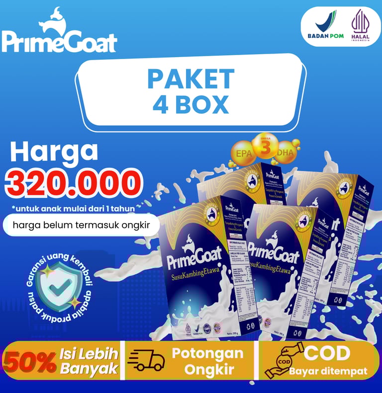 Diperkaya dengan Omega-3 DHA & EPA, protein tinggi, serta serat pangan, PrimeGoat membantu meningkatkan kecerdasan, menjaga kesehatan pencernaan, dan mendukung berat badan yang ideal.